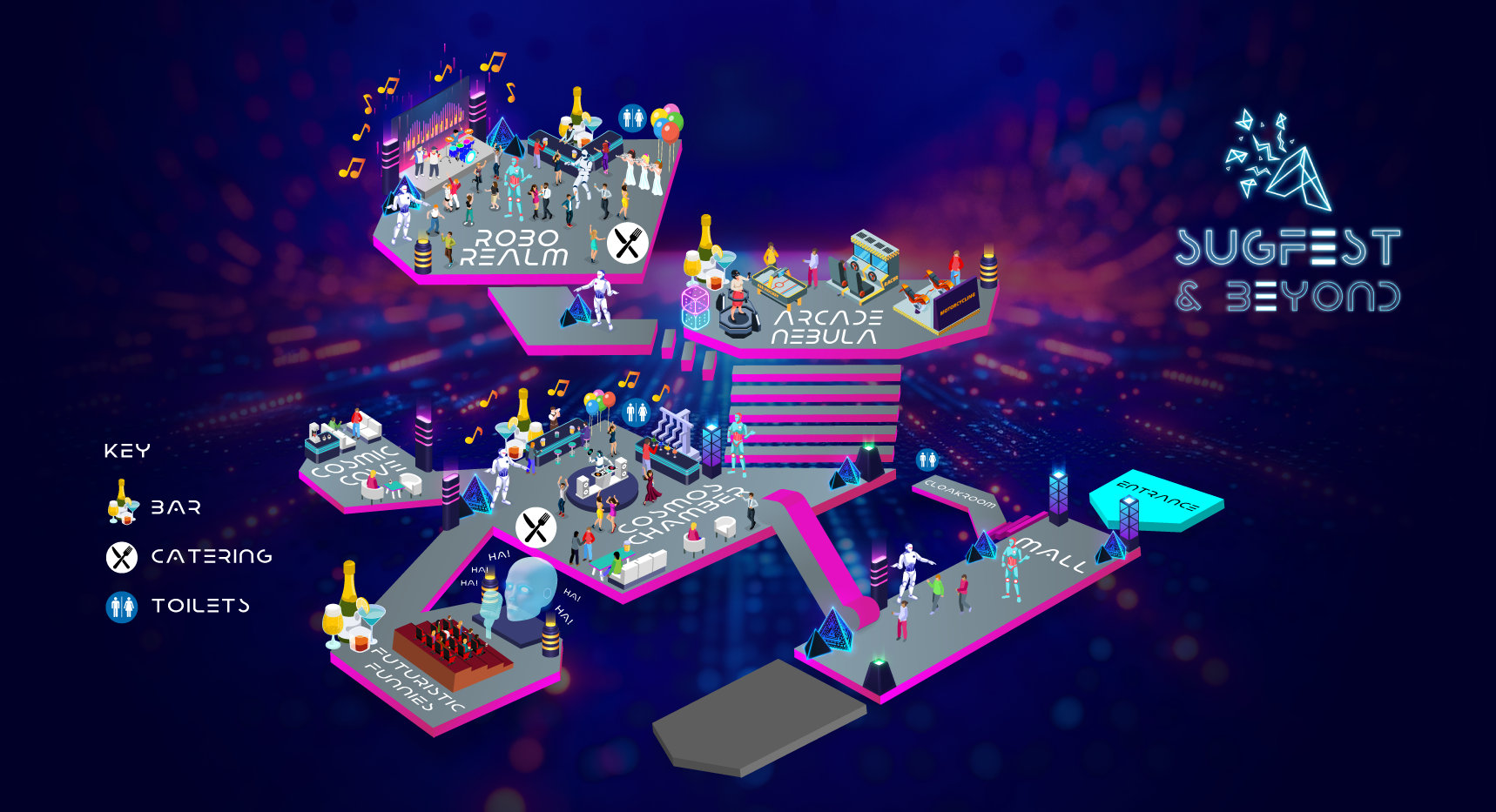 Explore themed zones like the Cosmos Chamber for easy networking, Futuristic Funnies for our famous comedy sets from The Manford’s Comedy Show, Arcade Nebula for immersive VR gaming and the ultimate party room: Robo Realm - where live music and headline acts will keep you dancing all night long.